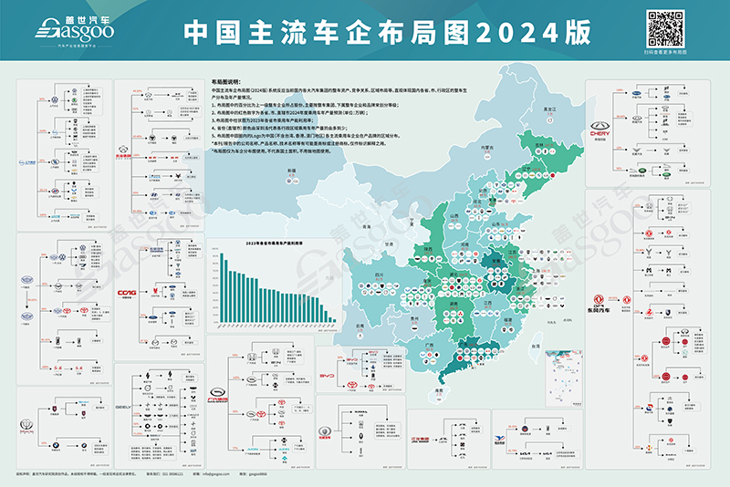 中国主流车企布局图(2024版)系统反应当前国内各大汽车集团的整车资产、竞争关系、区域布局等,直观体现国内各省、市、行政区的整车分布及年产量情况。