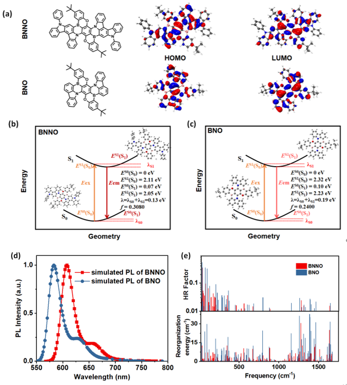 图1. BNNO和BNO (a) HOMO/LUMO 分布, (b), (c) 重组能 (λ), (d) 模拟光谱, e) 不同频率下黄昆因子、重组能对比.