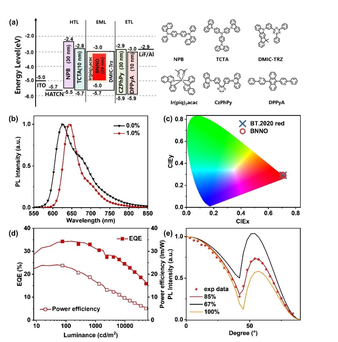 图2. (a)OLED器件能级图及所用材料,(b) 1000 cd/m2 亮度下电致光谱,(c) 器件CIE 坐标图,(d) 器件效率, (e) 薄膜中BNNO分子水平取向.